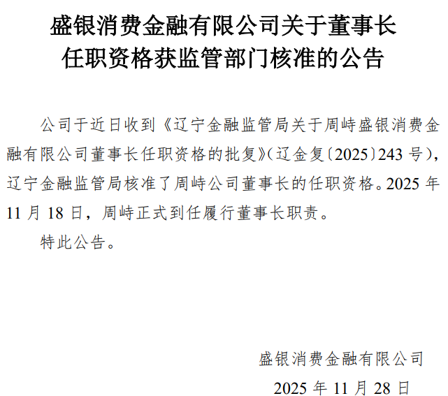 11月28日,盛银消费金融官网发布公告,周峙董事长任职资格已获得监管核准,自11月18日起正式履职。