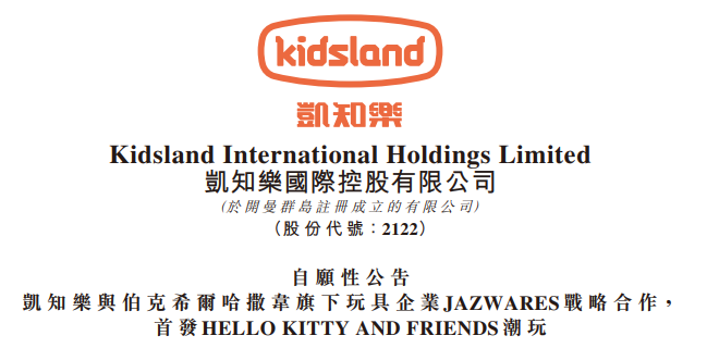 凯知乐国际(02122.HK)(Kidsland)宣布,携手潮流玩具公司Jazwares在中国大陆市场首发HELLO KITTY AND FRIENDS玩具。