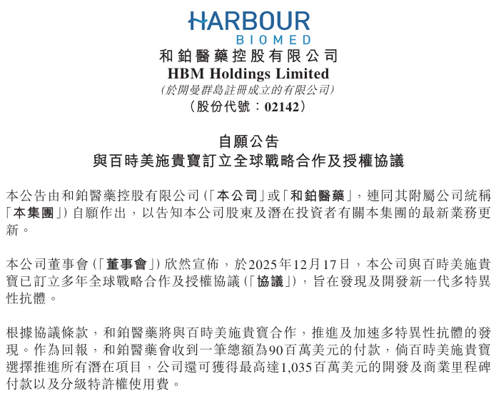 2025年12月7日,全球生物制药公司和铂医药(Harbour BioMed,02142.HK)宣布与美国百时美施贵宝(Bristol Myers Squibb,简称BMS)签署全球战略合作许可协议,共同开发新一代多特异性抗体。根据协议条款,和铂医药将获得9000万美元现金,以及高达10.35亿美元的开发和商业里程碑付款。该合作聚焦“新一代多特异性抗体”——这一高阶抗体疗法通过同时靶向多个信号通路,旨在提高治疗效力并减少毒副作用。