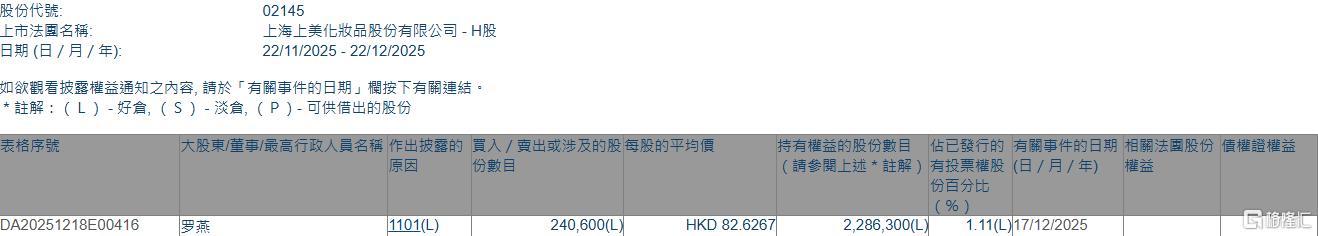 格隆汇12月22日丨根据联交所最新权益披露资料显示,2025年12月17日,上美股份(02145.HK)获执行董事罗燕在场内以每股均价82.6267港元增持24.06万股,涉资约1988万港元。