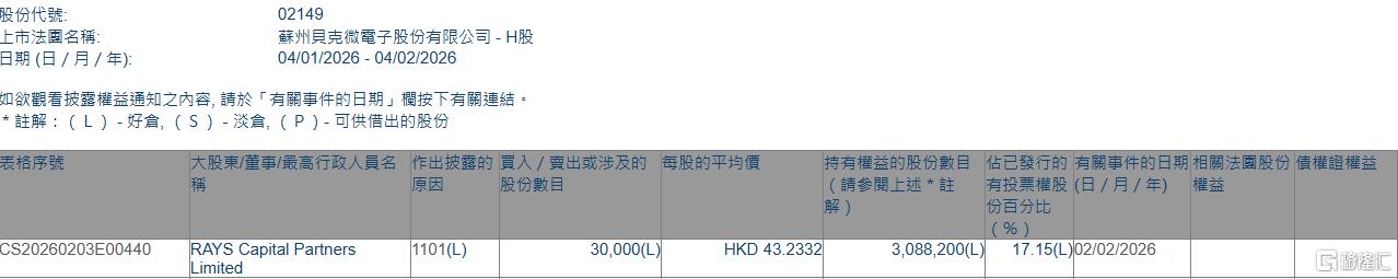 格隆汇2月4日丨根据联交所最新权益披露资料显示,2026年2月2日,贝克微(02149.HK)获RAYS Capital Partners Limited在场内以每股均价43.2332港元增持3万股,涉资约129.7万港元。