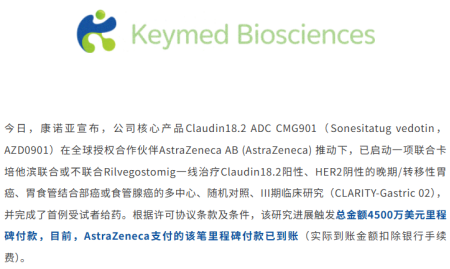 3月10日,康诺亚宣布,确认其与乐普生物的合资公司KYM Biosciences授权给阿斯利康的核心产品——Claudin 18.2抗体偶联药物(ADC)CMG901(AZD0901),在全球关键注册性临床研究CLARITY-Gastric 02中完成首例受试者给药。