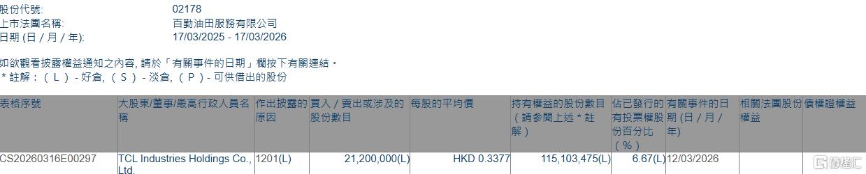 格隆汇3月17日丨根据联交所最新权益披露资料显示,2026年3月12日,百勤油服(02178.HK)遭TCL Industries Holdings Co., Ltd.在场内以每股均价0.3377港元减持2120万股,涉资约715.92万港元。