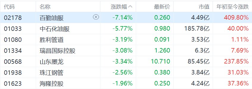 格隆汇3月18日|港股市场油气设备与服务股普跌,其中,百勤油服跌超7%,中石化油服跌超5%,胜利管道、瑞昌国际控股、山东墨龙跌超3%。