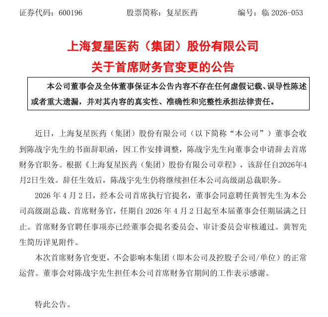 4月2日晚间,复星医药发布公告称,因工作安排调整,陈战宇先生向董事会申请辞去首席财务官职务。辞任生效后,陈战宇先生仍将继续担任公司高级副总裁职务。经公司首席执行官提名,董事会同意聘任黄智先生为公司高级副总裁、首席财务官。