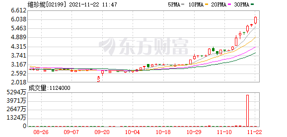 维珍妮(2199.HK)再度拉升涨7.19%,报6.11港元创2019年7月以来新高价,总市值达75亿港元。该股自15日发布中报预喜以来持续上涨,近日更是走出8连涨,区间涨幅超50%。