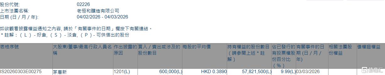 格隆汇3月4日丨根据联交所最新权益披露资料显示,2026年3月3日,老恒和酿造(02226.HK)遭股东茅惠新在场内以每股均价0.389港元减持60万股,涉资约23.34万港元。