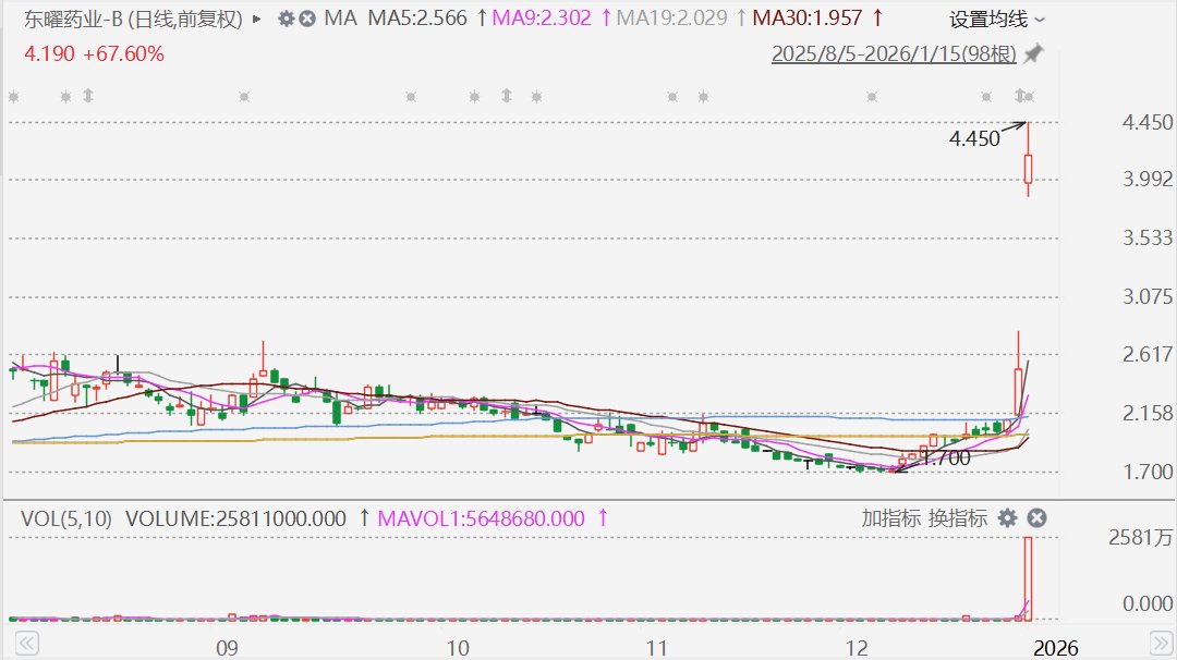 东曜药业(1875.HK)获药明合联(2268.HK)提出全面收购要约,今日复牌股价飙升,盘中一度涨78%至4.45港元,股价创2021年11月以来新高,截至目前成交额放大至1亿港元。