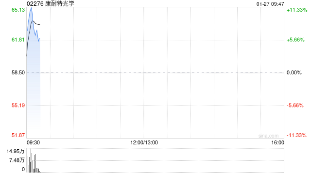 康耐特光学(02276)盘中大涨超11%,高见65.35港元,创上市新高。截至发稿,股价上涨6.67%,现报62.40港元,成交额6998.09万港元。