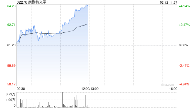 康耐特光学(02276)午前涨超4%,截至发稿,股价上涨4.82%,现报64.15港元,成交额3981.42万港元。
