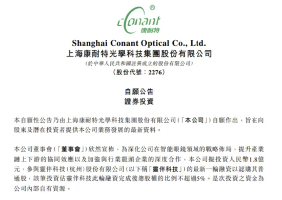 3月29日,港股上市公司康耐特光学(02276)发布公告称,公司拟以自有资金出资1.8亿元人民币参与灵伴科技(杭州)股份有限公司最新一轮融资,完成后持股比例不超过5%。