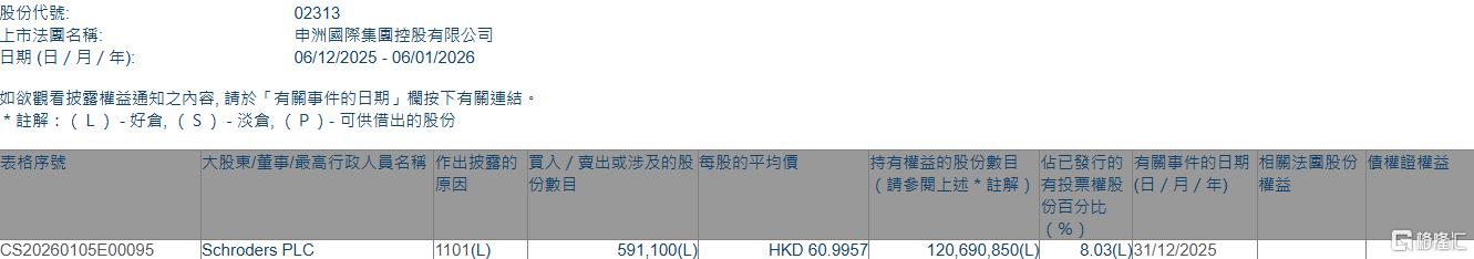 格隆汇1月6日丨根据联交所最新权益披露资料显示,2025年12月31日,申洲国际(02313.HK)获Schroders PLC在场内以每股均价60.9957港元增持59.11万股,涉资约3605.5万港元。