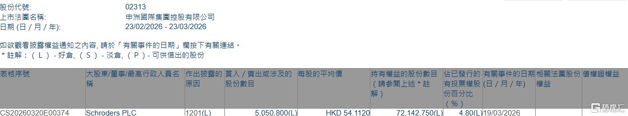 格隆汇3月23日丨根据联交所最新权益披露资料显示,2026年3月19日,申洲国际(02313.HK)遭Schroders PLC在场内以每股均价54.112港元减持505.08万股,涉资约2.73亿港元。