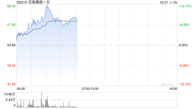 百奥赛图-B(02315)盘中涨超12%,截至发稿,股价上涨7.99%,现报58.10港元,成交额1.05亿港元。
