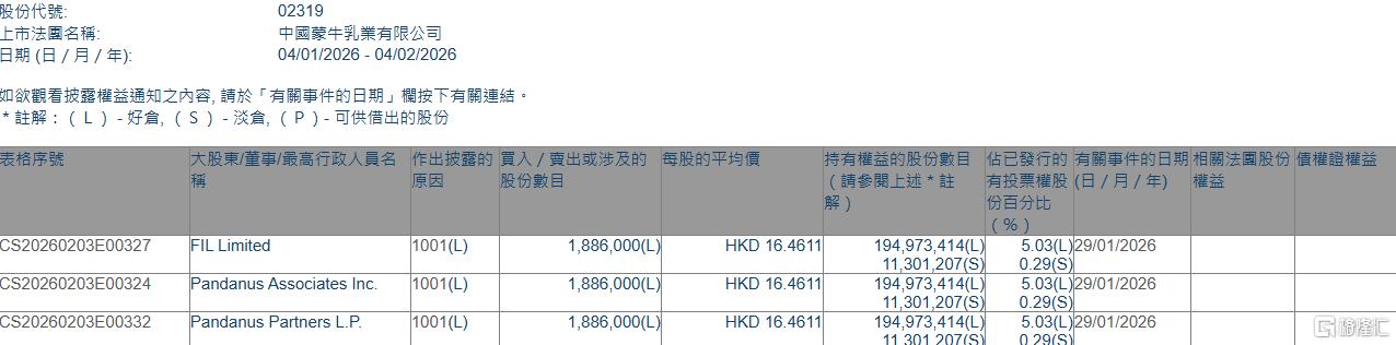 格隆汇2月4日丨根据联交所最新权益披露资料显示,2026年1月29日,蒙牛乳业(02319.HK)获FIL Limited在场内以每股均价16.4611港元增持好仓188.6万股,涉资约3104.56万港元。