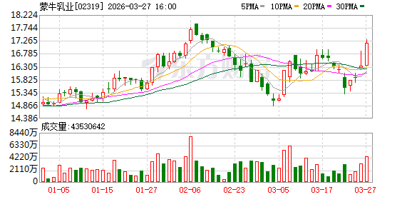 蒙牛乳业的强势表现仍在继续。年报后的第二个交易日即3月27日,公司股价再次拉涨。截至收盘,公司股价大涨5.27%,再一次领涨乳业股。仅用两个交易日,蒙牛乳业市值轻松增加约50亿港元,市值直逼700亿港元。