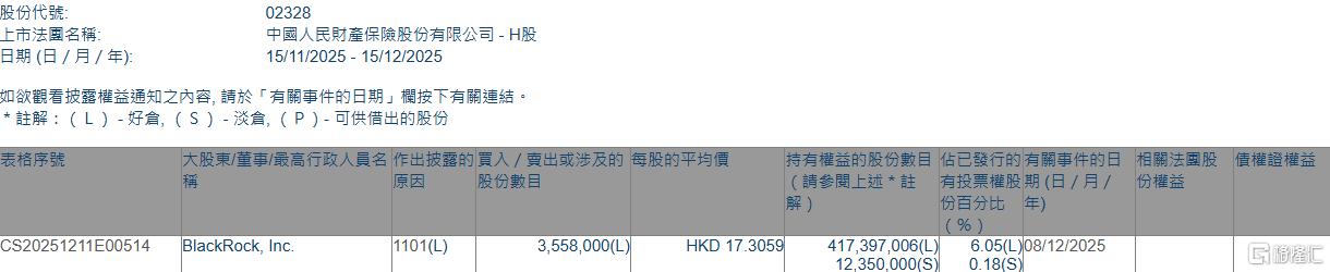 格隆汇12月15日丨根据联交所最新权益披露资料显示,2025年12月8日,中国财险(02328.HK)获BlackRock, Inc.在场内以每股均价17.3059港元增持好仓355.8万股,涉资约6157.44万港元。