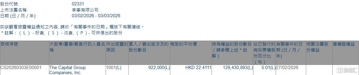 格隆汇3月3日丨根据联交所最新权益披露资料显示,2026年2月27日,李宁(02331.HK)获The Capital Group Companies, Inc.在场内以每股均价22.4111港元增持92.2万股,涉资约2066.3万港元。