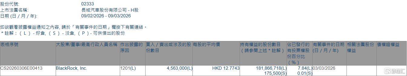 格隆汇3月9日丨根据联交所最新权益披露资料显示,2026年3月3日,长城汽车(02333.HK)遭BlackRock, Inc.在场内以每股均价12.7743港元减持好仓456.3万股,涉资约5828.91万港元。