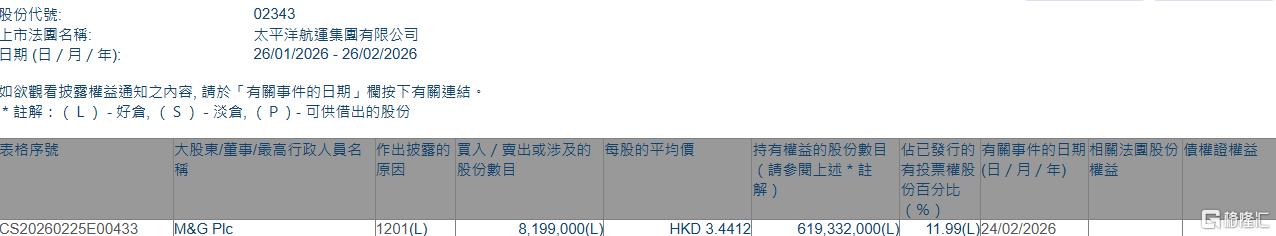 格隆汇2月26日丨根据联交所最新权益披露资料显示,2026年2月24日,太平洋航运(02343.HK)遭M&G Plc在场内以每股均价3.4412港元减持819.9万股,涉资约2821.4万港元。