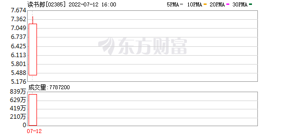7月12日,读书郎(HK:02385)正式登陆港交所,上市发行价为7.60港元/股,拟发行5200万股,募资净额约3.65亿港元。开盘价为5.4港元/股,下跌28.9%。截至收盘报7.2港元/股,收跌5.26%。