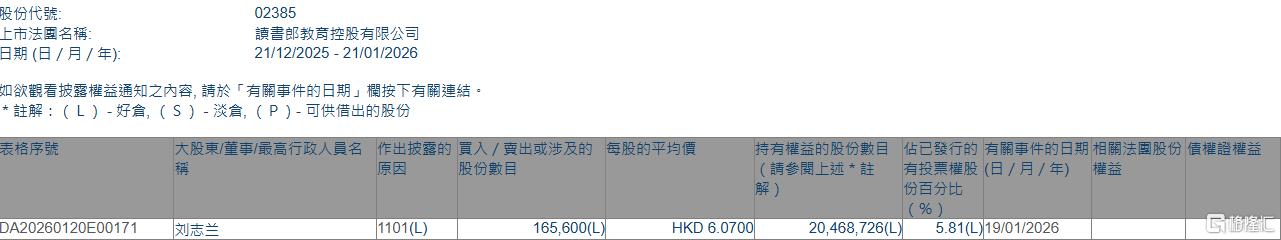 格隆汇1月21日丨根据联交所最新权益披露资料显示,2026年1月19日,读书郎(02385.HK)获执行董事刘志兰在场内以每股均价6.07港元增持16.56万股,涉资约100.52万港元。