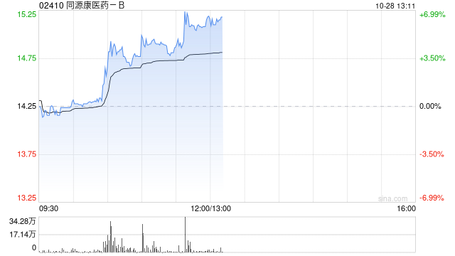 同源康医药-B(02410)午后股价上涨5.97%,现报15.10港元,成交额7564.32万港元。