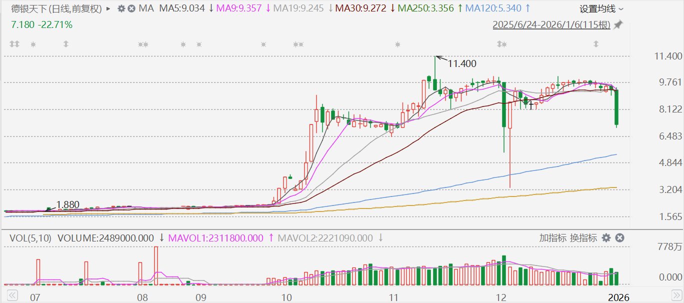 格隆汇1月6日|在12月3日初因被点名股权高度集中出现暴跌行情后,德银天下(2418.HK)今日再度暴跌,收跌22.71%报7.18港元,股价创12月4日以来新低。