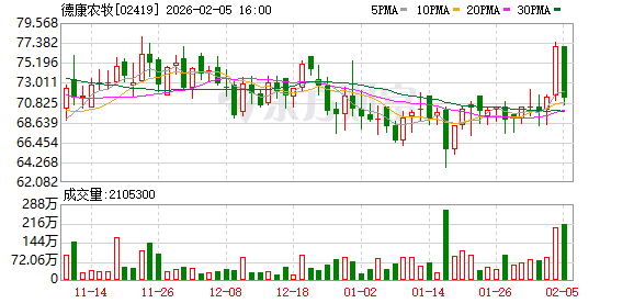 德康农牧(02419)发布公告,2026年2月5日,公司回购股份5.57万股,回购金额为400万港元。