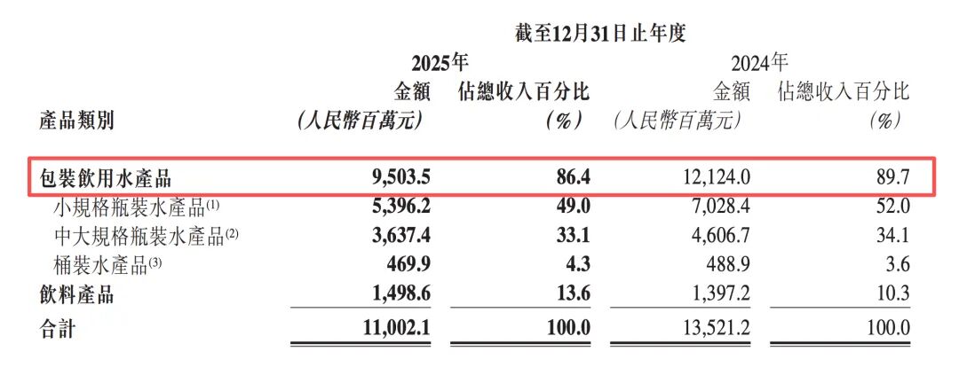 财报显示,华润饮料饮用水板块去年收入95.04亿元,同比下滑21.6%。从规格来看,小瓶水、中大瓶水和桶装水全线承压,曾经最有竞争力的小瓶水受冲击最大,营收同比下滑23%至53.96亿元。