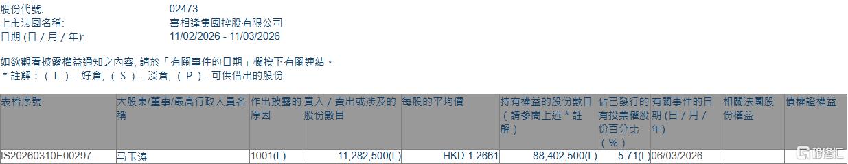 格隆汇3月11日丨根据联交所最新权益披露资料显示,2026年3月6日,喜相逢集团(02473.HK)获股东马玉涛在场内以每股均价1.2661港元增持1128.25万股,涉资约1428.5万港元。