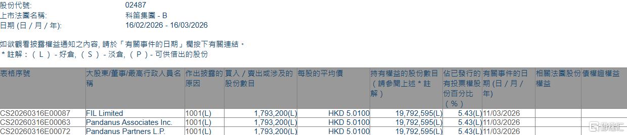 格隆汇3月16日丨根据联交所最新权益披露资料显示,2026年3月11日,科笛-B(02487.HK)获FIL Limited在场内以每股均价5.01港元增持179.32万股,涉资约898.39万港元。