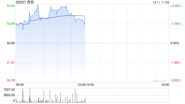 西锐(02507)盘中涨超3%,截至发稿,股价上涨3.12%,现报54.5港元,成交额621.59万港元。