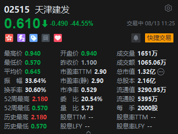 8月12日消息,港股天津建发盘中跳水跌超44%,报0.61港元,成交额1065.06万港元,总市值1.32亿港元,今年四月上市以来股价跌去七成。