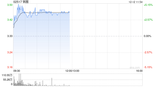 锅圈(02517)盘中涨超4%,截至发稿,股价上涨3.60%,现报3.45港元,成交额5978.47万港元。