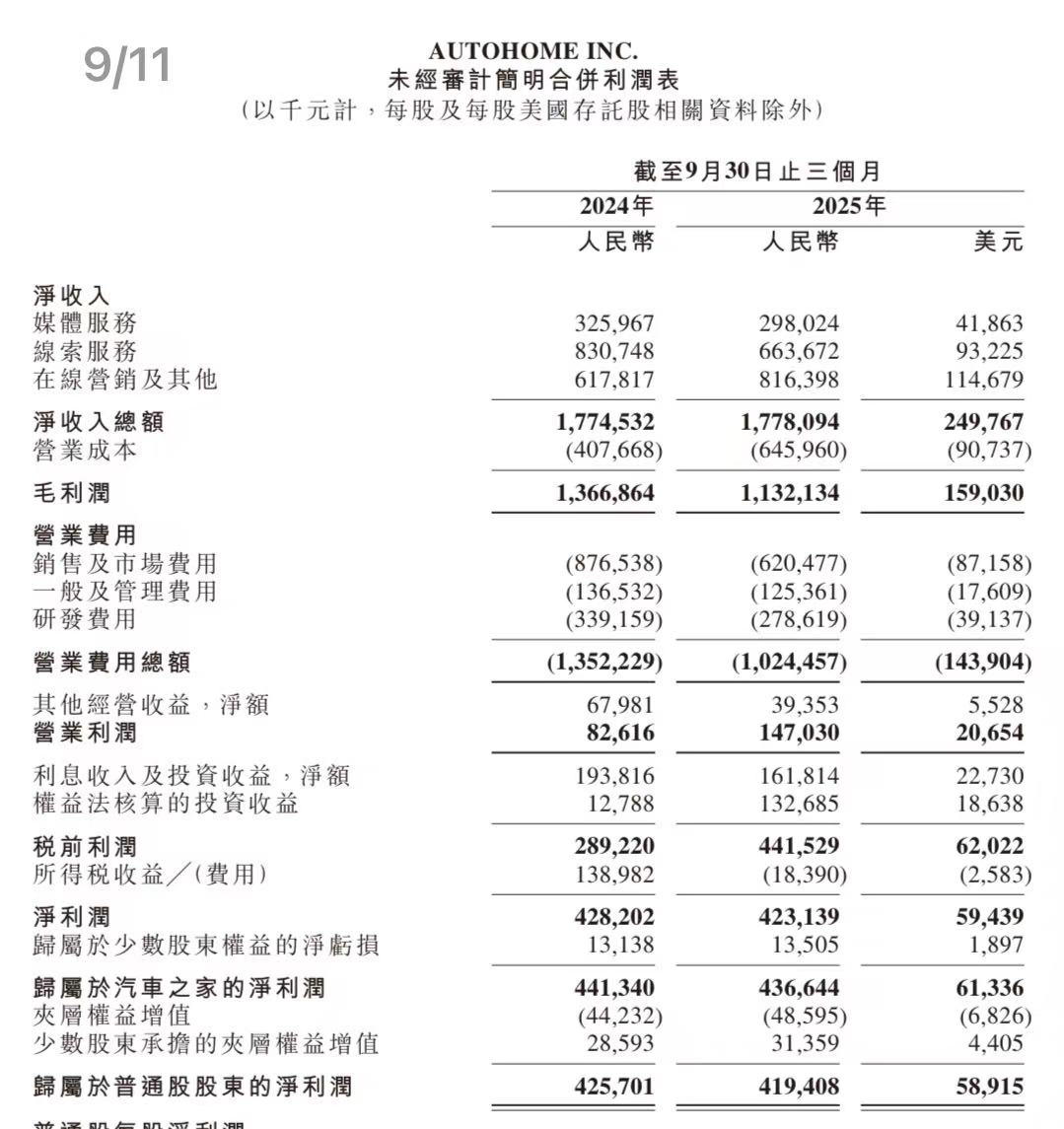 汽车之家2025年第三季度主要业绩指标 图片来源:汽车之家2025年第三季度未经审计财务业绩