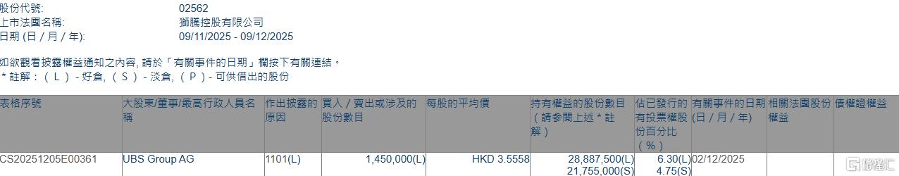 格隆汇12月9日丨根据联交所最新权益披露资料显示,2025年12月2日,狮腾控股(02562.HK)获UBS Group AG在场内以每股均价3.5558港元增持好仓145万股,涉资约515.6万港元。