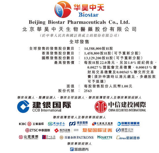 华昊中天医药,计划全球发售1458.80万股H股(约占发行完成后总股份的约4%),其中90%为国际发售、10%为公开发售,每股发售价介乎16.0~22.0港元,每手200股,最多募资约3.21亿港元。