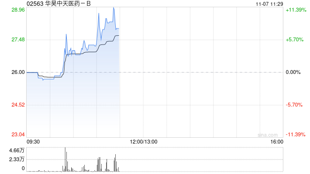 华昊中天医药-B(02563)早盘涨超10%,高见29港元,较招股价16港元已涨超80%。截至发稿,股价上涨10.58%,现报28.75港元,成交额1414.98万港元。