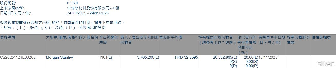 格隆汇11月24日丨根据联交所最新权益披露资料显示,2025年11月18日,中伟新材(02579.HK)获Morgan Stanley在场内以每股均价32.5595港元增持376.52万股,涉资约1.23亿港元。