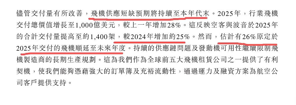 的财报里面说了25年预计交付飞机的26%交付延期了