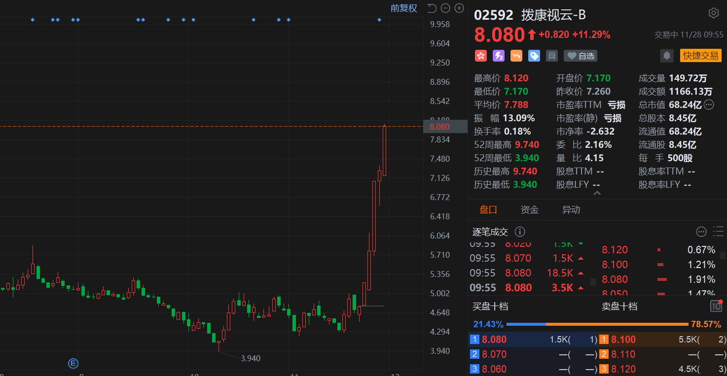 格隆汇11月28日|拨康视云-B(2592.HK)再度大幅上涨超11%,近6日连涨超70%,股价站上8港元大关,市值68.24亿港元。消息上,拨康视云-B日前公告,获日本及欧洲两项专利,用于核心产品CBT-009延缓近视及眼部疾病治疗。