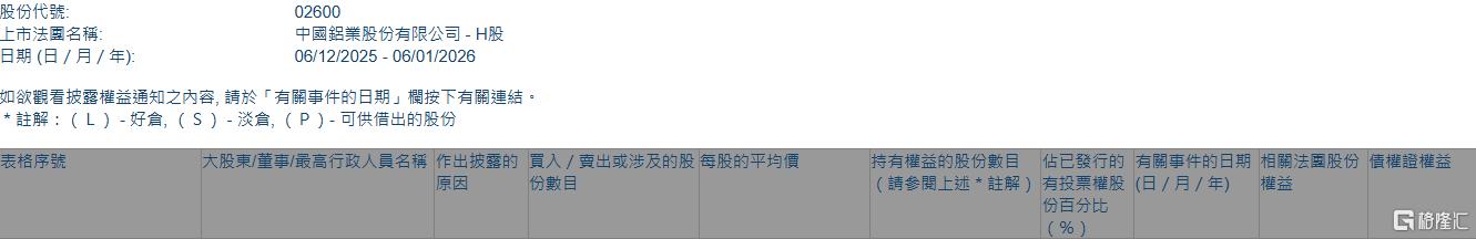 格隆汇1月6日丨根据联交所最新权益披露资料显示,2025年12月30日,中国铝业(02600.HK)获JPMorgan Chase & Co.以每股均价12.1243港元增持好仓349.26万股,涉资约4234.5万港元。