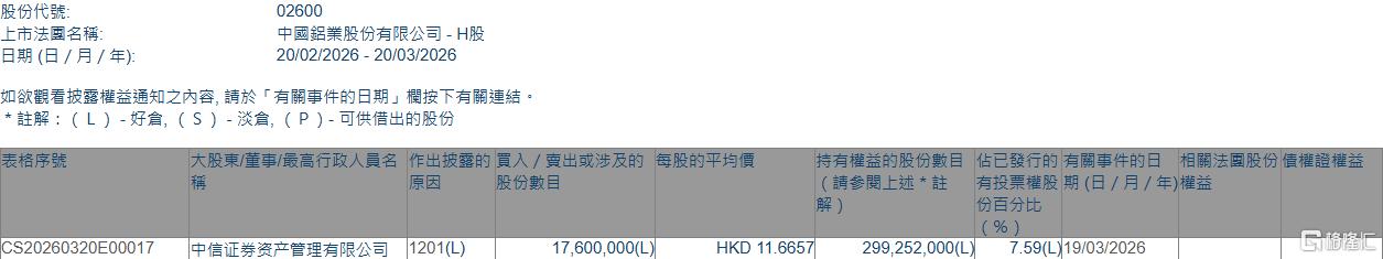 格隆汇3月20日丨根据联交所最新权益披露资料显示,2026年3月19日,中国铝业(02600.HK)遭中信证券资产管理有限公司在场内以每股均价11.6657港元减持1760万股,涉资约2.05亿港元。