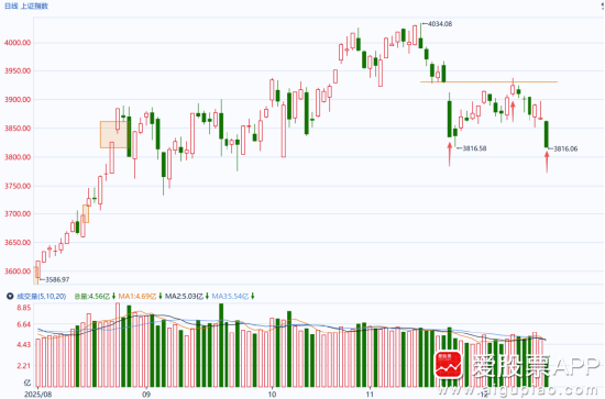 首先,我们来看一看上证指数目前的盘面表现:上证指数自11月21日以向下跳空缺口发出首个技术转弱信号后,虽于12月8日反抽尝试回补缺口,但最终承压回落。此后指数持续走低,并于今日再度收阴,跌破一个月前形成的低点。