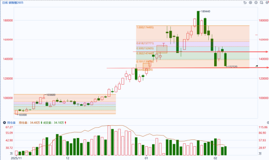 目前价格正测试年初上涨起点附近的关键支撑区域,参考1月5日高点130260元/吨附近,该位置在技术分析中具有重要意义:若有效跌破,则可能预示新一轮技术性调整的开启,下方空间或有望打开。