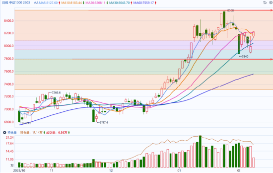今日,中证1000股指期货主力合约呈现技术性反弹格局。盘面显示,主力IM2603合约完成了一轮标准的技术性回踩,并于关键支撑位附近企稳,再次向上反弹。然而,从整体结构观察,价格尚未有效脱离震荡区间,主流均线仍呈现纠缠状态,表明短期趋势性方向尚不明确。从盘面上看,下方重要支撑可参考7800整数关口附近,而上方压力则关注前期高点8568附近区域。