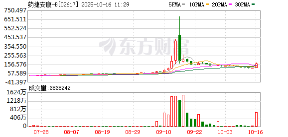 北京商报讯10月16日,药捷安康(02617.HK)盘中股价大涨,一度涨逾50%,截至北京商报记者发稿,药捷安康报161.8港元/股,涨幅为42.56%。