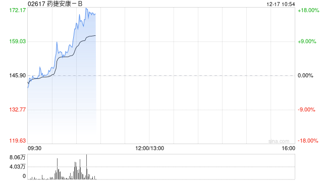药捷安康-B(02617)早盘拉升16.45%,现报169.90港元,成交额1.79亿港元。
