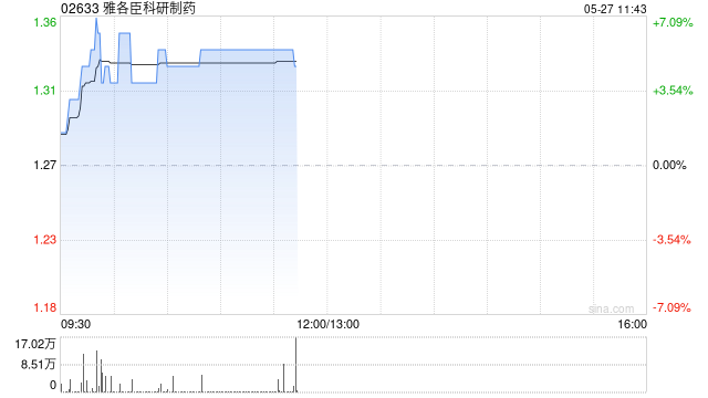 雅各臣科研制药(02633)午前股价上涨5.51%,现报1.34港元,成交额143.67万港元。